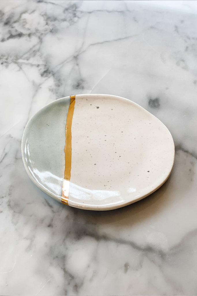 The handmade jewelry tray, adorned with white, duck egg blue and a delicate gold stripe, exudes an elegant charm, perfect for showcasing your treasured adornments.