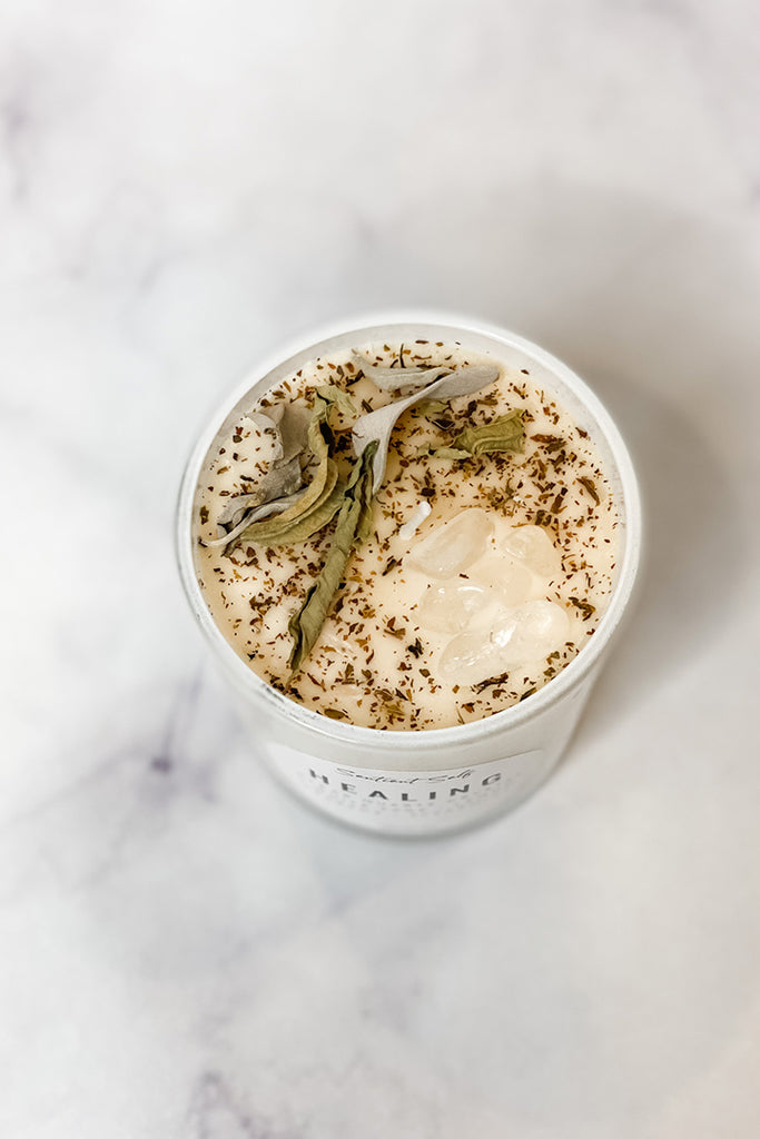12 oz. 100% soy wax scented candles made with love and special intentions. Made with genuine crystals, Herbs, and love! Each are made by hand and were specially crafted to bring you good vibes, love, abundance and healing!