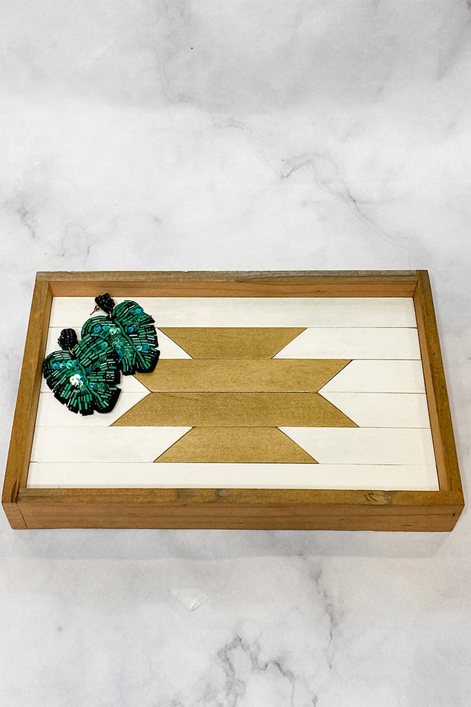 Made from reclaimed lumber and edged with found barn wood, this decorative tray is sure to be a beautiful addition to your home. Each piece of wood is carefully cut and sanded, painted or stained and sealed, and assembled by hand in the workshop. When it is not resting in the living room, it is also great for storing jewelry and perfume, holding bottles and glasses on the bar cart, or books and flowers on the coffee table.