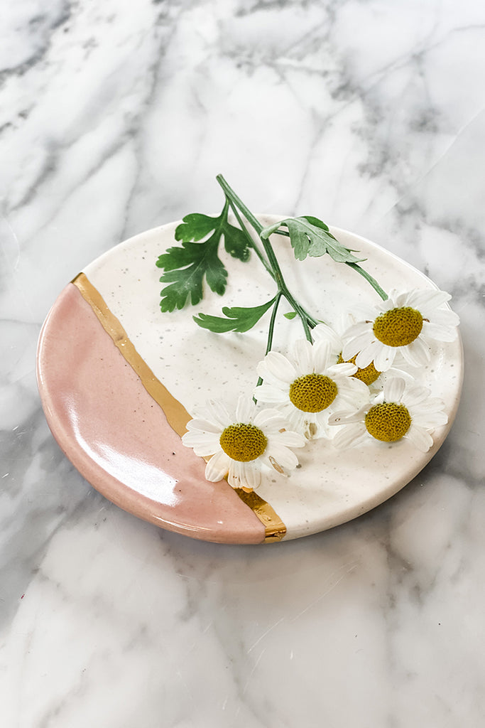 Store your rings, your necklaces, and any other type of jewelry on this intricate, pink, and gold trinket tray by Pottery by Eleni.