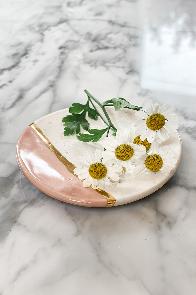 The handmade jewelry tray, adorned with white, pink and a delicate gold stripe, exudes an elegant charm, perfect for showcasing your treasured adornments.