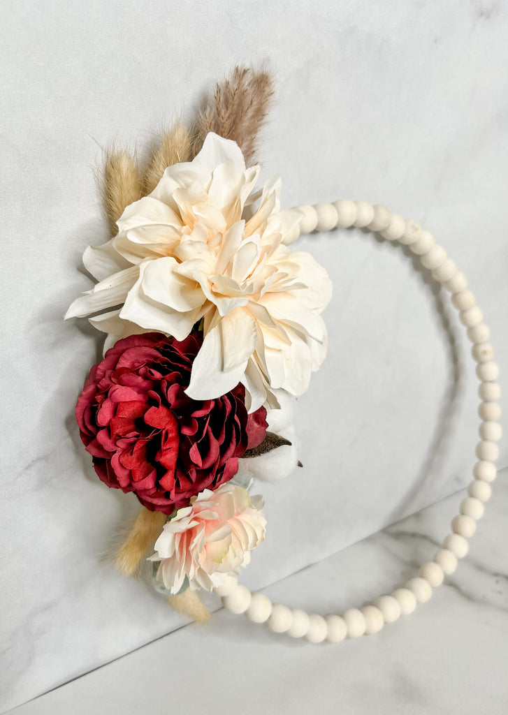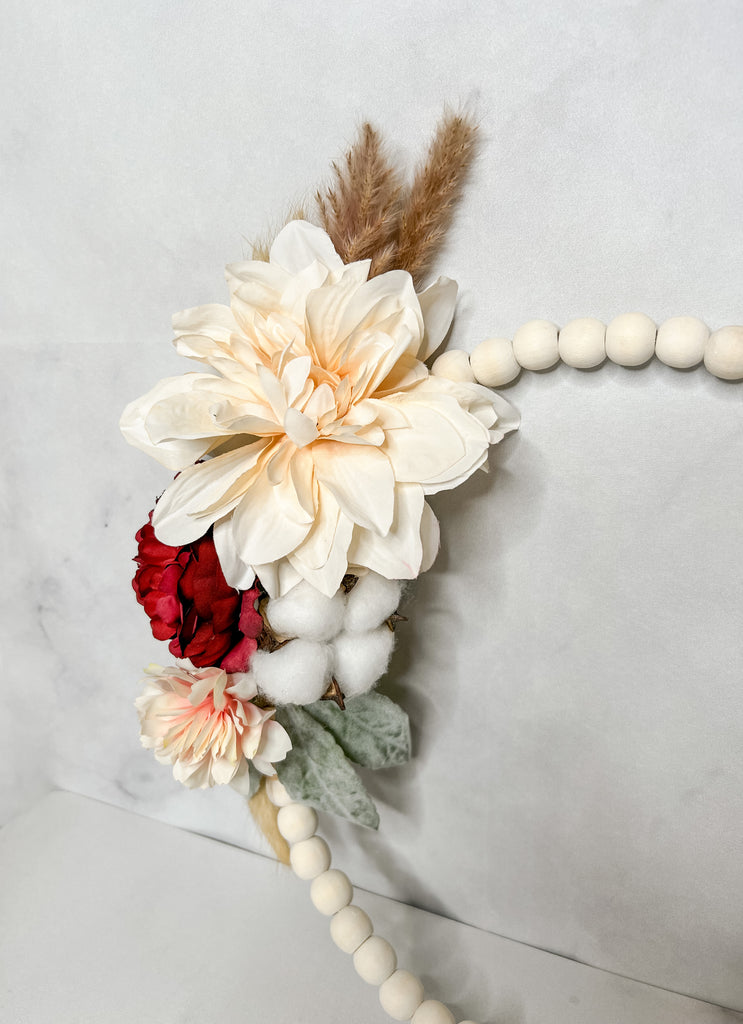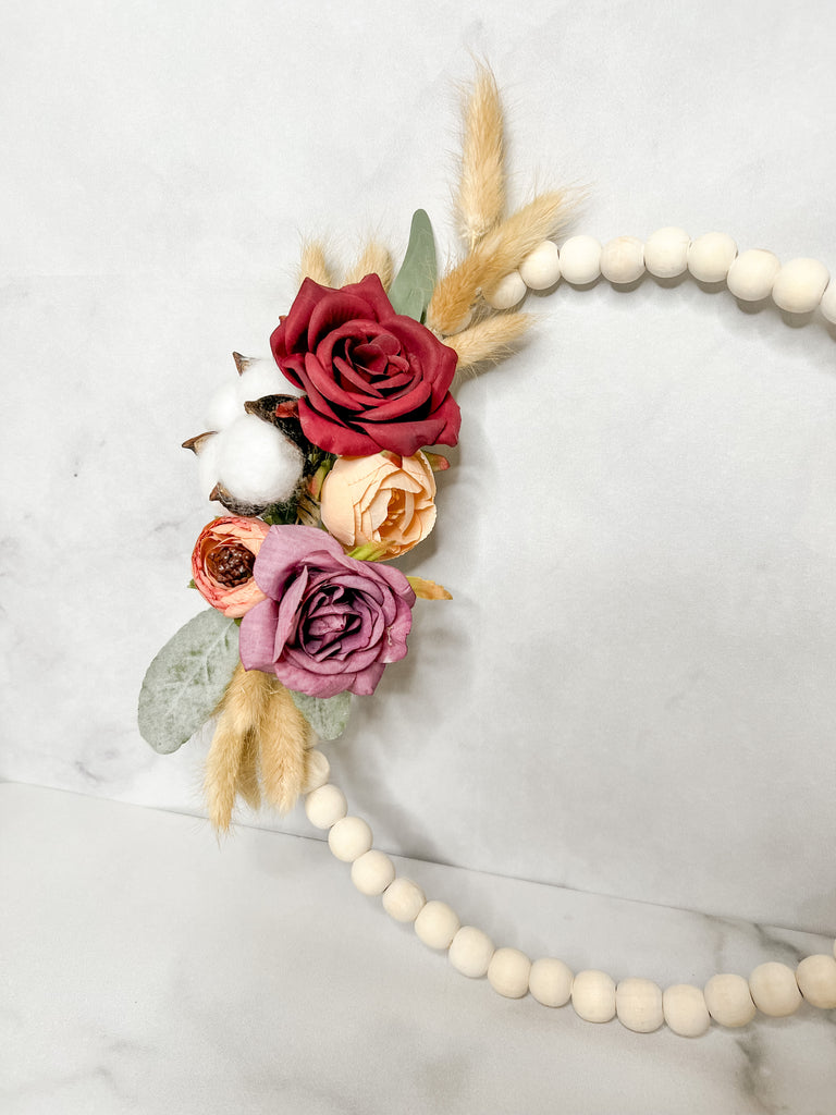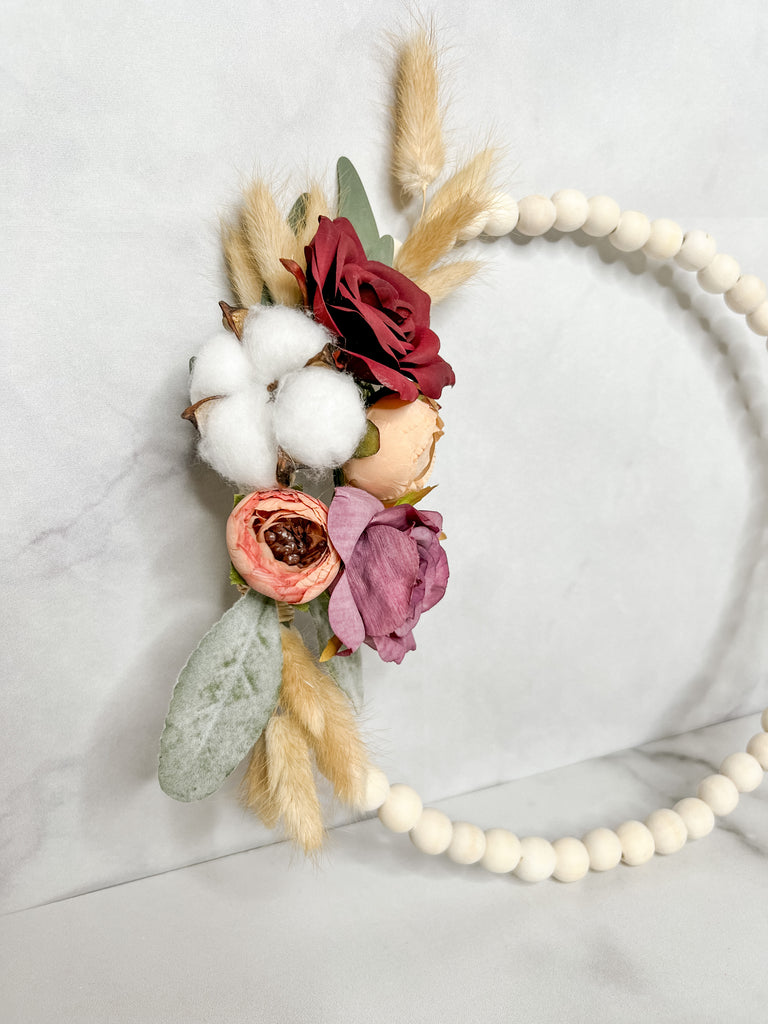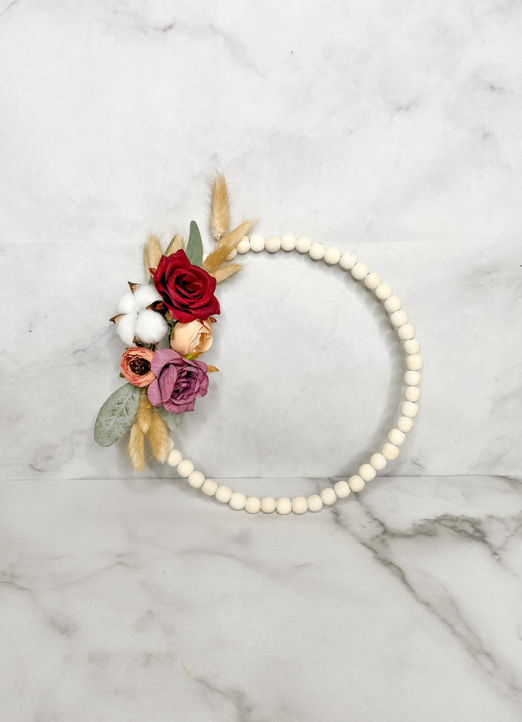 The Floral and Bead Wreath is the perfect addition to your home decor. It features a beautiful blend of flowers on a wreath of natural wood beads that will add a touch of elegance to your home. This wreath is perfect for any season.